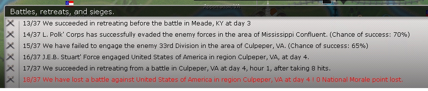 Me (USA): I'll answer the best I can. The first thing I learned is that the message log is very misleading. It should say Jeb's force was forced to engage ..... day 4. Also the 33rd div was a unit I set to Passive. I think this may be an auto message when a stack is in passive and an enemy enters the region. Not sure on that one.