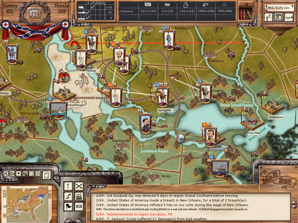 But still, an assault force of one or two strong divisions, Farragut with a decent fleet for support and a bunch of Militia to leave behind as garrisons while the main force continues "harbor hopping" should give Jeff Davis a headache, just like those meddlesome gray raiders behind the union lines give it to Abe Lincoln...