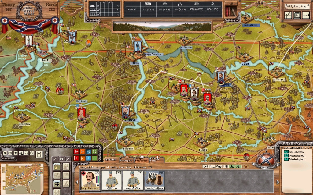 General A.S. Johnston will organize his army into three Corps as well. I Corps under General Breckenridge, II Corps under General Hardee, and III Corps under General Bragg. General Breckinridge will move North with his Corps and defend the area around Jackson, Tennessee south of Humbolt. The other two Corps, and the army HQ will move to the area around Lauderdale, Alabama, just south of Pulaski Tennessee. From this position, General Johnston should be in a position to support the attack on Nashville.