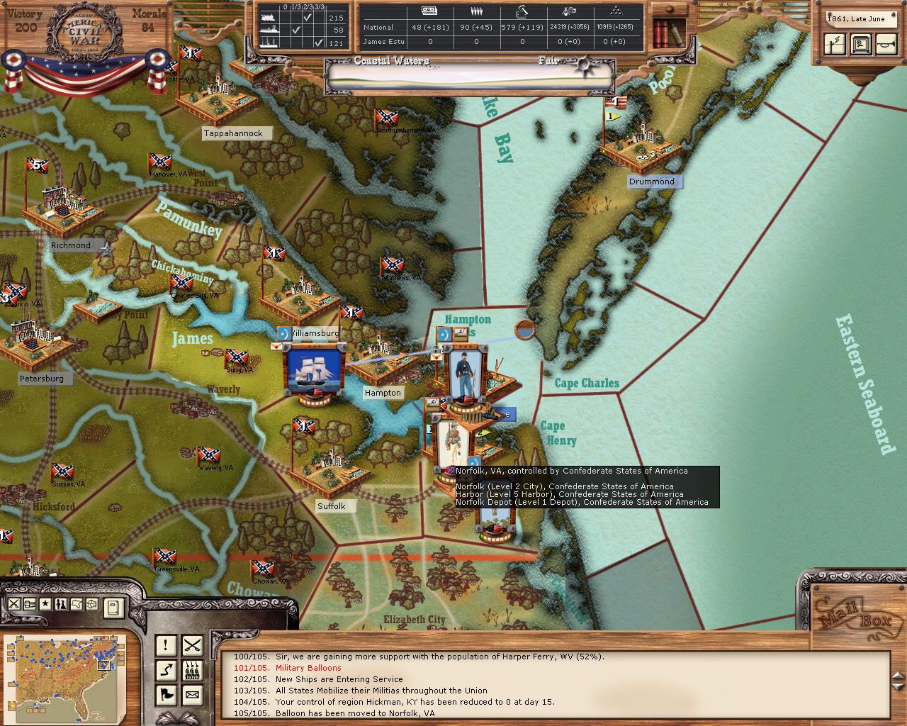 First Union Balloon appears in Norfolk a turn after the city has already fallen to the Confederates. I wondered if it was possibly before the "Northern Evacuation of the Port" event. Any thoughts? (Strong wind answers don't count :bonk: )