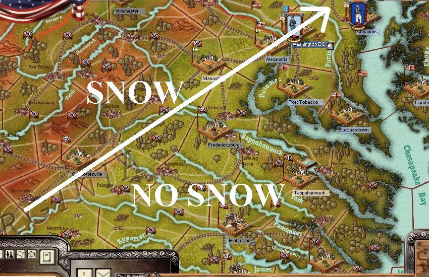 The areas just North of, and including the line Gallatin - Nashville - Clarksville - and Forts H & D, also get this extended weather effect, and since the South usually has these, it`s the same deal for the AI.