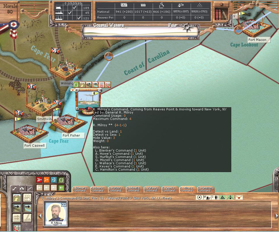 But attached are the first four turns of yet another CS v AI game where several US officers get sunk by Fort Morgan (it is usually Fort Sumter because they have started from Charleston, now that doesn't seem to be happening so often :wacko :) and Banks cops it after the last turn attached.