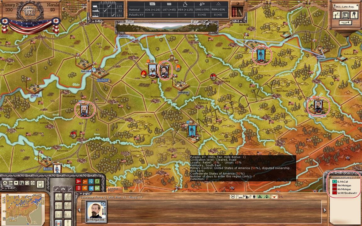 Going to answer just a quick one because I answered to lodilefty already. First, the most important resource in this game, as well as in real war, is time. "Firstest with the Mostest" carries the prize. In this case Missouri can only be carried by the south if the Union doesnt and the South invests heavily into this theatre. That is due to the fact that the Union can get their artillery into Missouri earlier then the CSA. Ad to that that Lyons is the most able commander in the early turns in the West to both sides most of the time (given slightly randomized leaders).