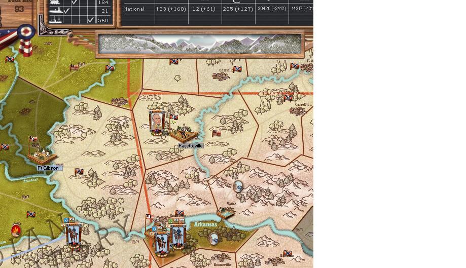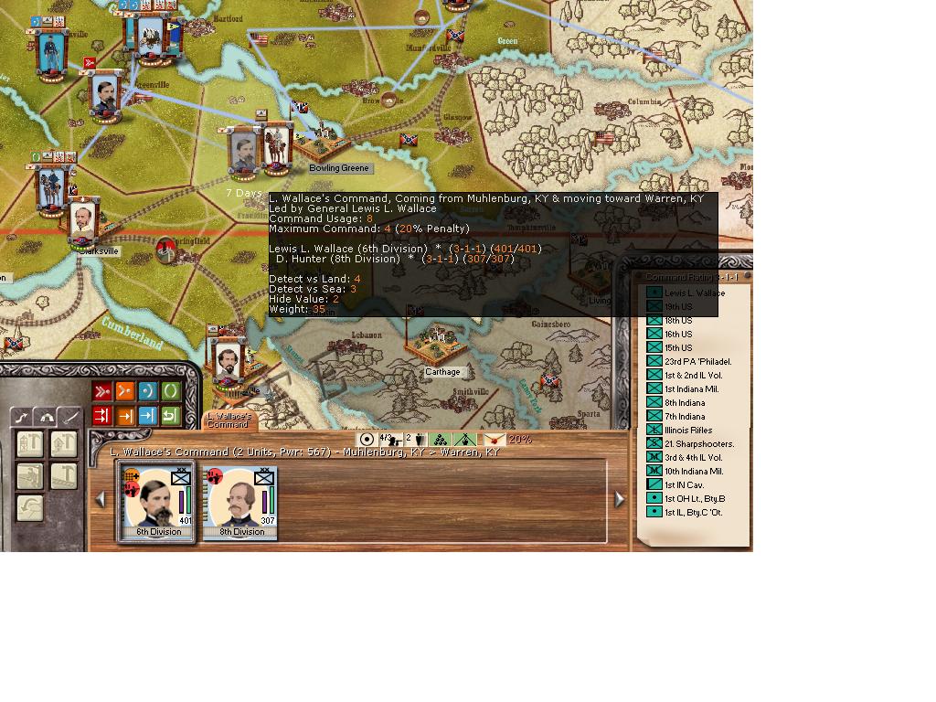 Lyon is finally ready and has some naval assets to clear the stretch of river north of Paducah. A risky move considering, but lyon with a division of militia and a small command malus will board transports at St. Louis and head to Ft. Henry/Donelson. Foote, selected for promotion this turn, will lead 2 ironclads and a handful of gunboats to clear the path for Lyon. Lyon is estimated to arrive on day12. Wallace, from Louisville, is ordered to Evansville Ill to be Lyon's reserve.
