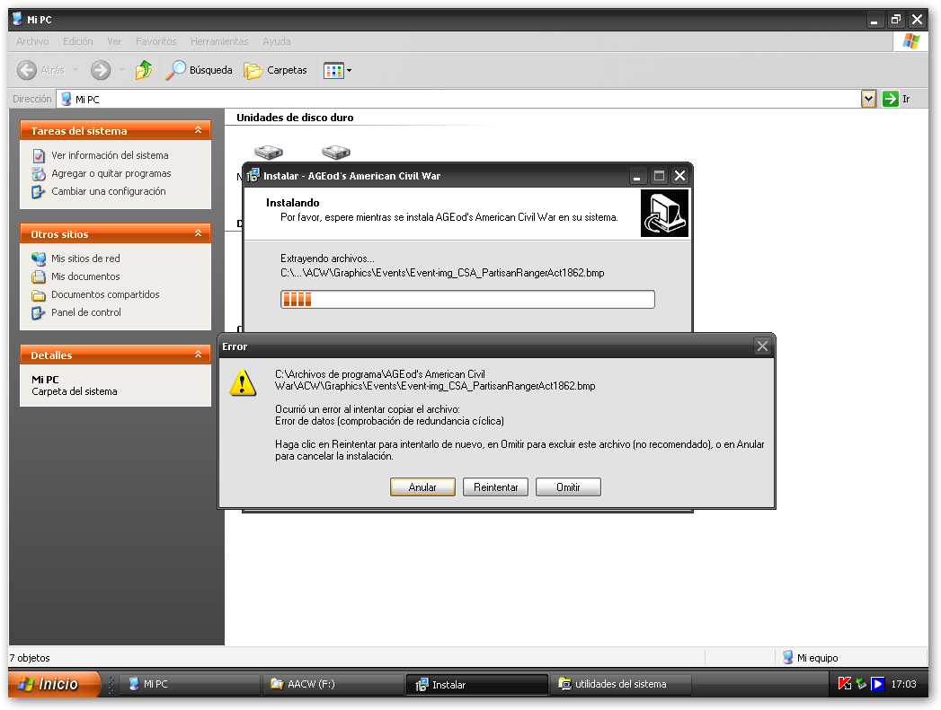 Ocurre que ahora he querido hacer borrón y cuenta nueva y he desistalado todo y quiero hacer una instalación limpia, pero.... durante la instalación me sale el siguiente mensaje : "ocurrió un error al intentar copiar el archivo: error de datos (comprobación de redundancia cíclica).- envio imagen.