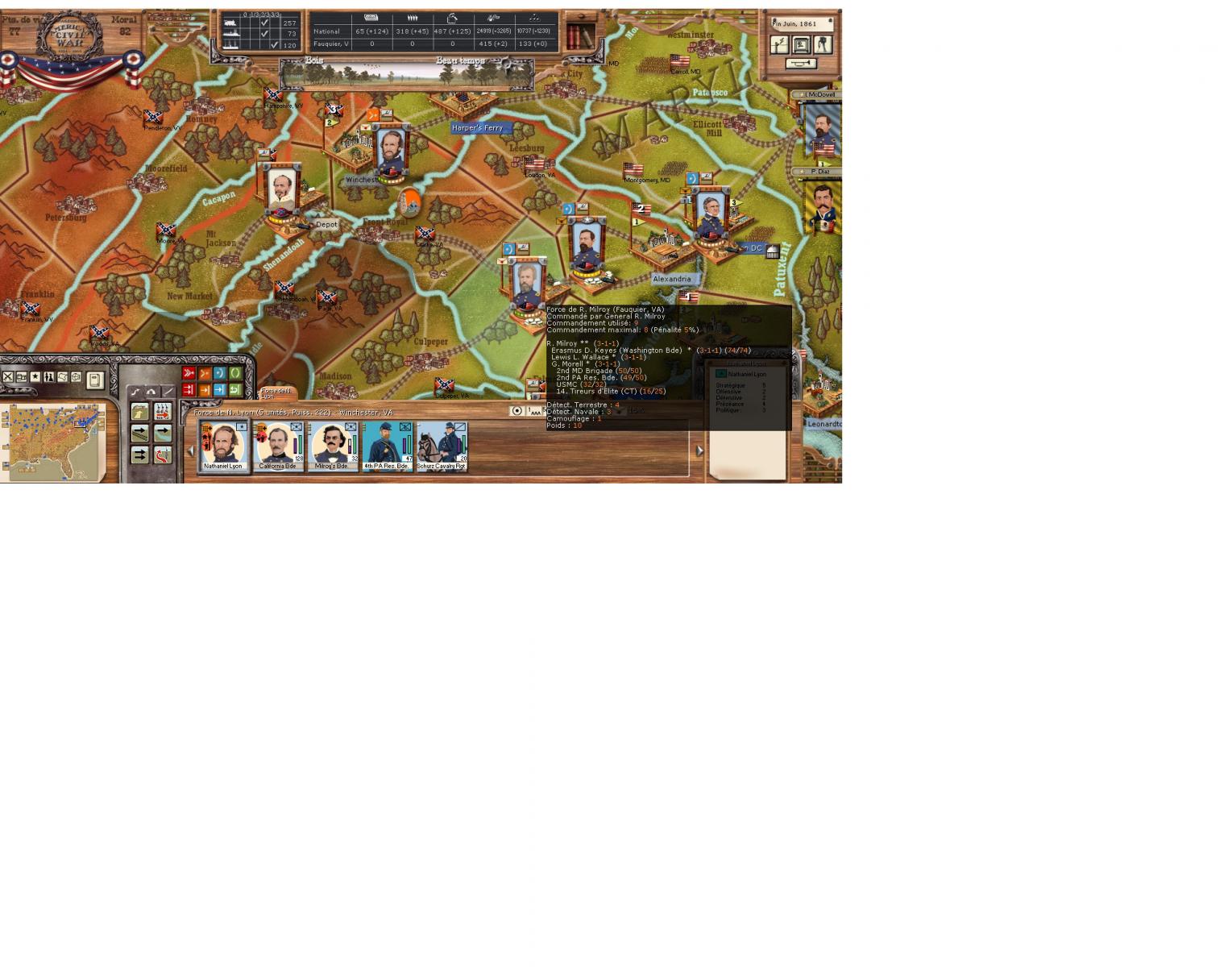 Ahora voy por inicios de septiembre, me he hecho fuerte en Harper's Ferry y Manassas, el Sur invadió Kentucky y está teniendo la respuesta correspondiente, mientras en Missouri la cosa está más o menos estable. En Nueva York y Boston se está concentrando una fuerza que atacará las fortificaciones rebeldes costeras por un lado y New Orleana por otro, poniendo en práctica el plan Anaconda de Scott.