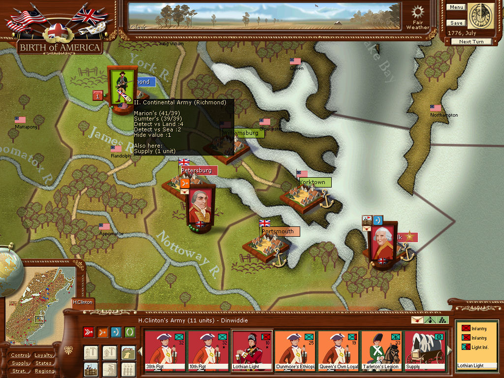 This is the situation in Vriginia, July 1776. I intend only to hold the Petersburg-Norfolk line for the time being. It may prove to have been a distraction that I could ill afford.