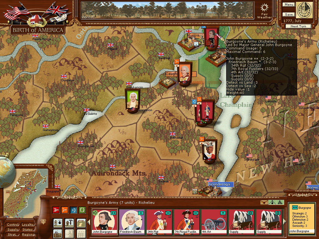 Van Riedesel continues to besiege St. John's in Richelieu, while Butler defeats a small force of dragoons commanded by H. Lee, capturing wagons as well. Burgoyne still inactive but SLOWLY crossing from Montreal to join von Riedesel.