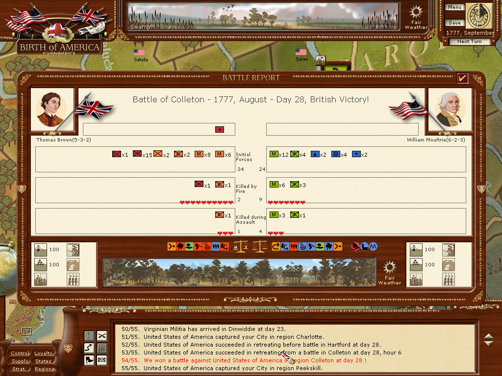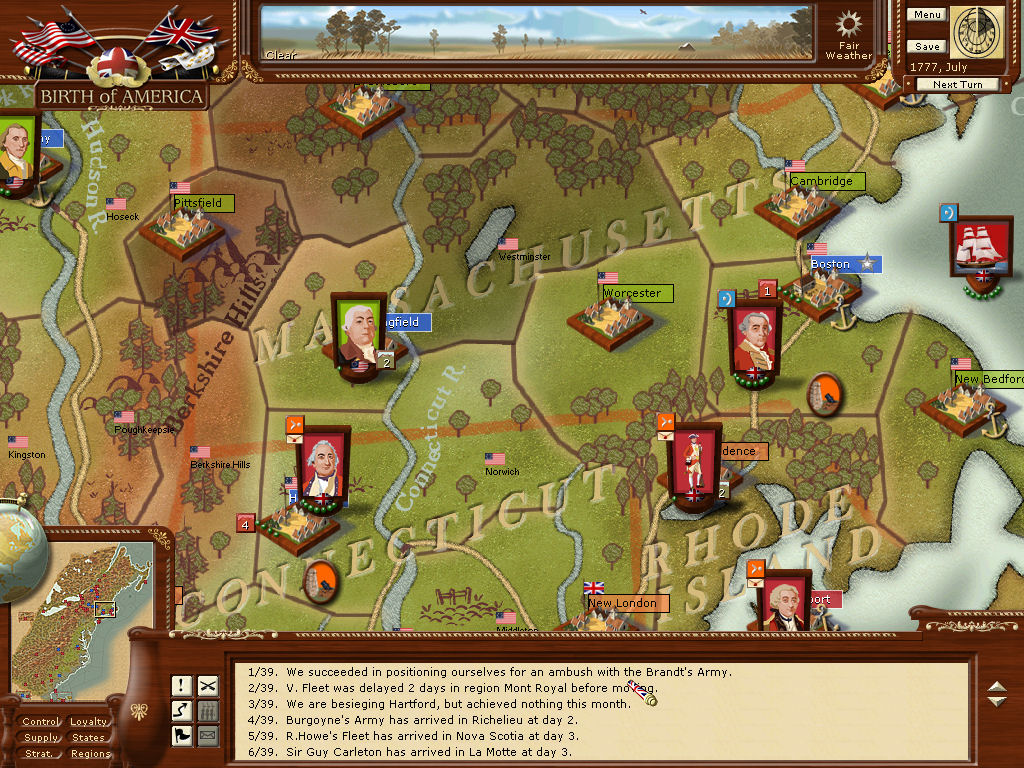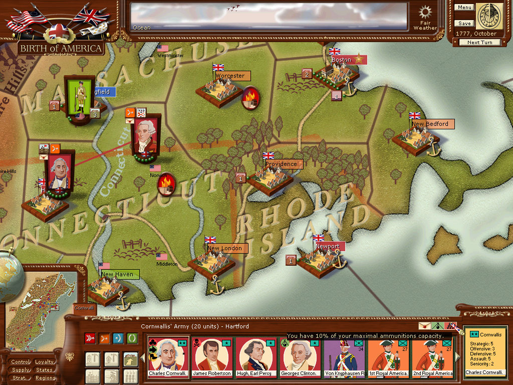 Cornwallis got a breach at Hartford and took it. He's dangerously low on ammo. The garrison seems to have escaped? Gray is across the river in eastern Connecticut, (my home, way up in the northeast corner of the area ) with plenty of supplies and on his way to Hartford. Hopefully, the large American force in Springfield won't be able to interfere.