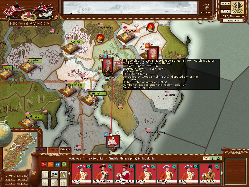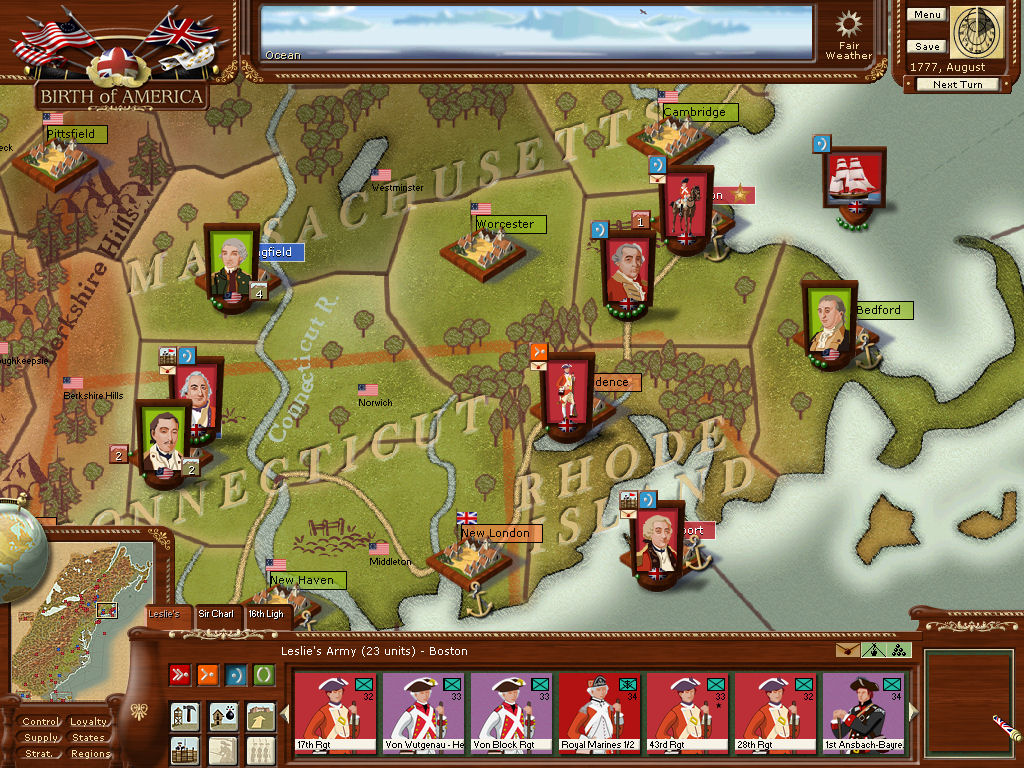 Depending on when and where major reinforcements show up, I plan to sail to New york City. I hope to also send a few regiments to bolster Clintonin Virginia, and a regiment or two to hold Savannah. I have refrained from sending any from the West Indies during the hurricane season. Also, I couldn't seem to load anything into the West Indies squadron, although no forces were locked.
