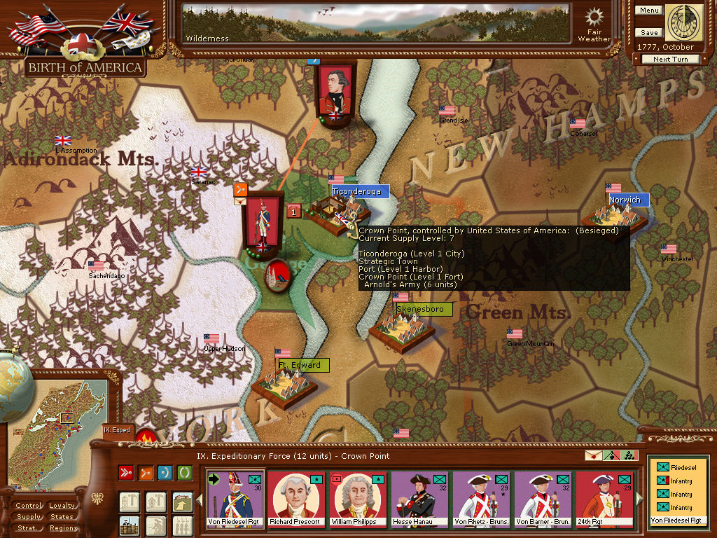 Von Riedesel continued along the shore of Lake Champlain and besieged Allen and St. Clair in Ticondera ( supply level 7 )