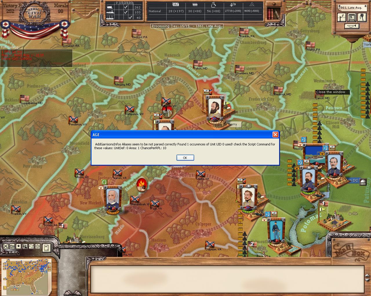 Franciscus wrote:Well, a little feedback is coming: playing as CSA, suggested settings. In early May 1861 a lonely not commanded brigade of around 1000 men detaches from McDowell's stack and attacks alone the locked CSA Army in Manassas - USA gets a good defeat, and CSA army gets unlocked, of course. Attached a zip with save and logs.
