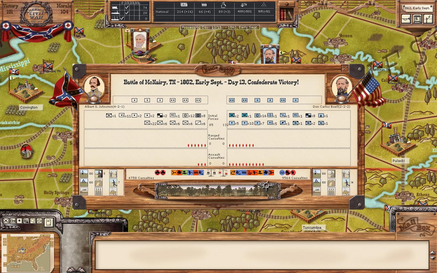 All infantry and cavalry regiments have had their strengths altered. Confederate regular infantry and cavalry now have 40 hits (increase from 20) and 15 men per hit (decrease from 50) for a toal regimental strength of 600 men. USA regular infantry and cavalry now have 35 hits (increase from 20) and 15 men per hit (decrease from 50) for a total regimental strength of 525 men. Other tweaks to light infantry, sharpshooters and other light units have been implemented to reflect an increased number of hits and a decreased number of men per hit. Overall regimental manpower of these irregular forces remain as close to the original as possible.