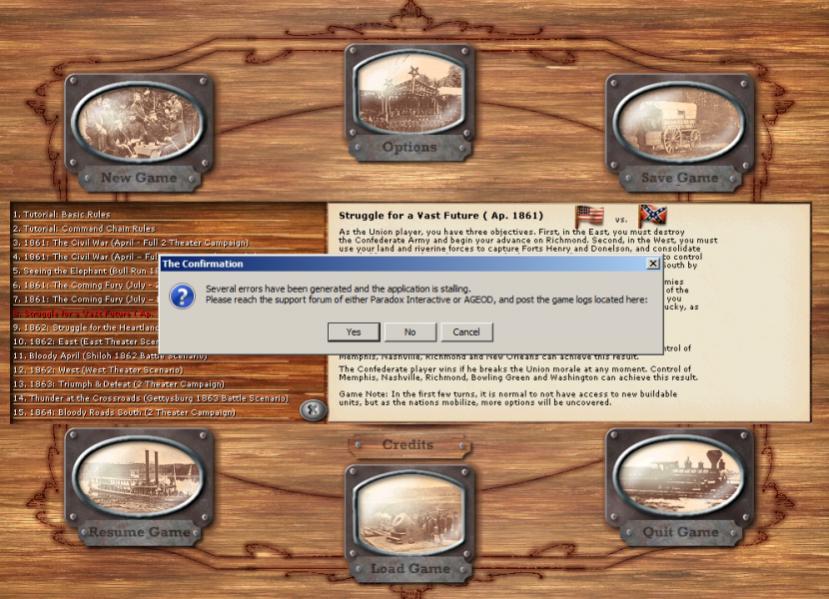 15:14:45  (Reporting)  TGameSim.OnNewGame_FilePicked         D:\Games\AGEod's American Civil War [SVF 2.0]\ACW\Scens\1861 Struggle for a Vast Future.scn Scenario file loaded, # of entries: 78527