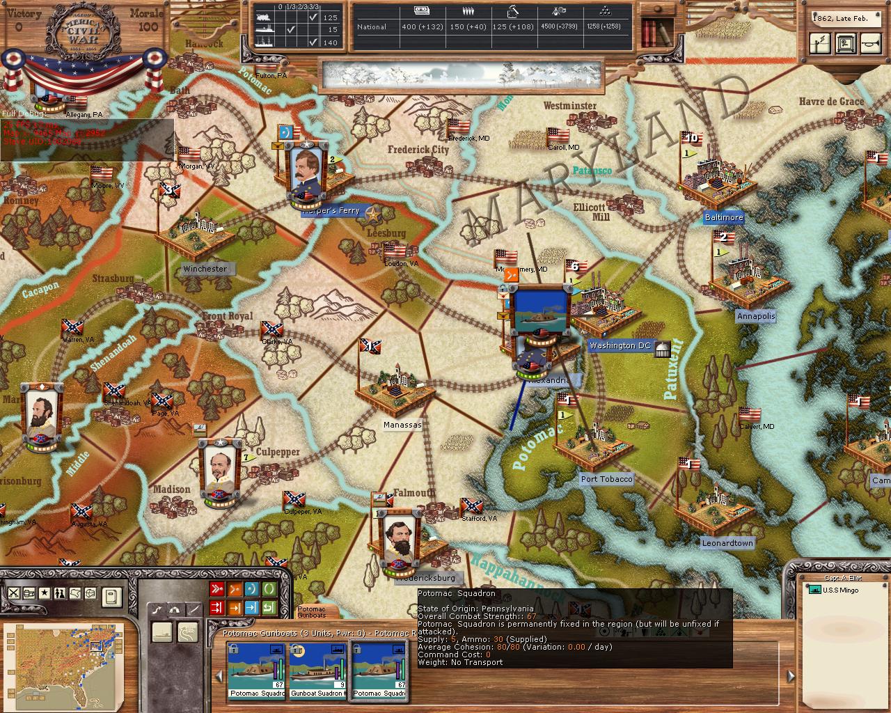 I've just added a new feature: gunboats on the Potomac. They were existing from the start of the war and one of the reason why CSA didn't never attempted to cross the Potomac from the Alexandria region to attack Washington.