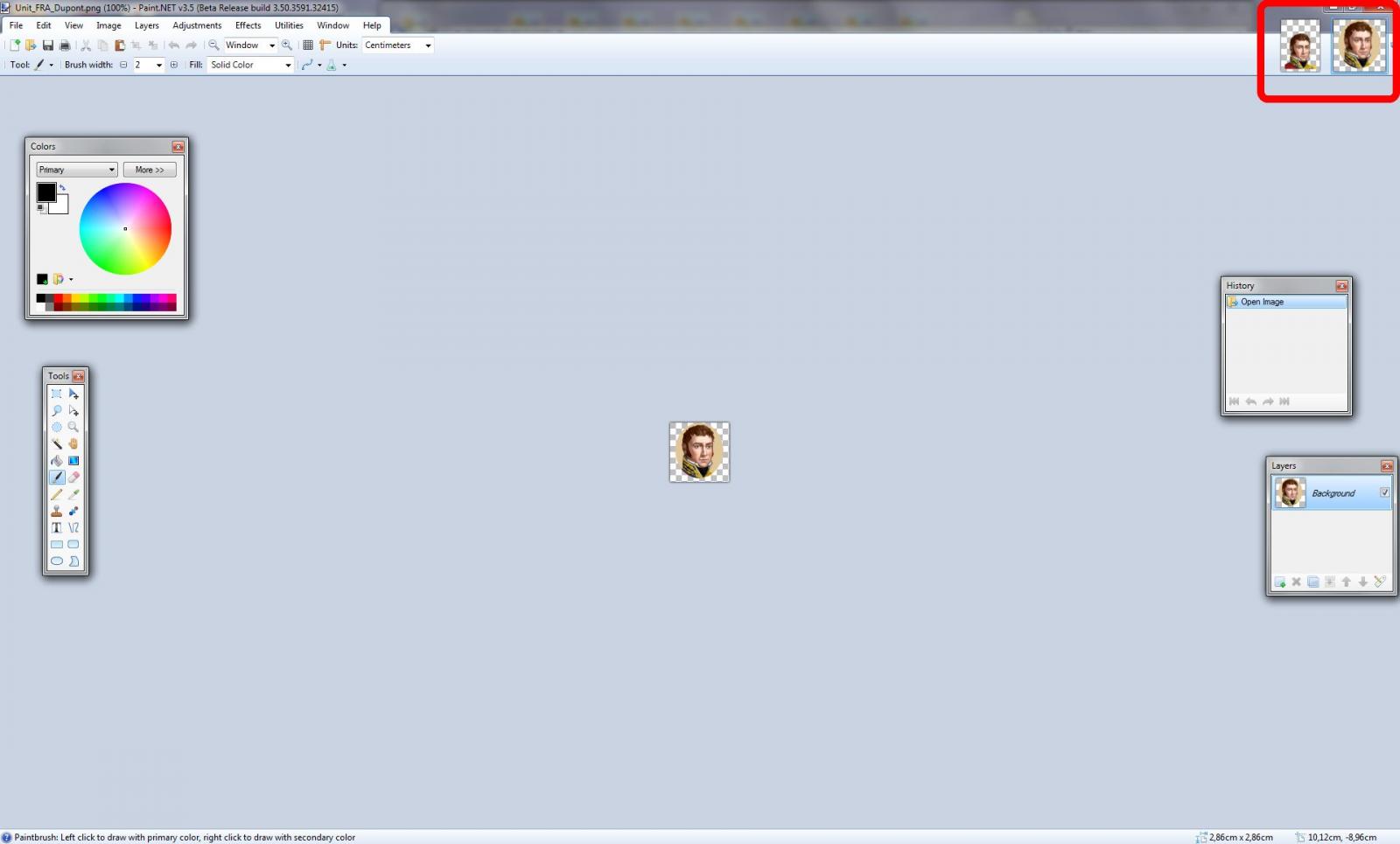 Open the picture of Napoleon in Paint. To work better, as it is a full body picture, cut the head and neck using the rectangle select tool. Now with that selected, edit and paste in as new image. You will have something like this. You have to look carefully at the original graphics so that only are shown the head and the neck