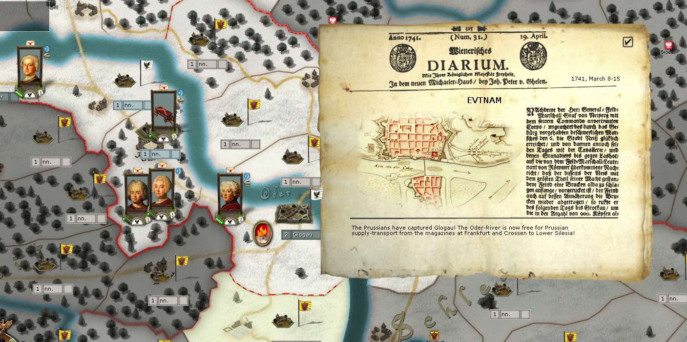Retro-look? :D This is 18th century look. The portraits are all from 1740/41, the Glogau-map in the event picture shows a map or the Prussians' capture of Glogau 1741 (assaults like these are very hard to model in the engine - historically speaking the assaulting Prussians had 51 casualties, the Austrians ca. 60) and the "newspaper" is the official Viennese proto-newspaper from 1741, with a report of Neippergs' actions in Moravia-Silesia.