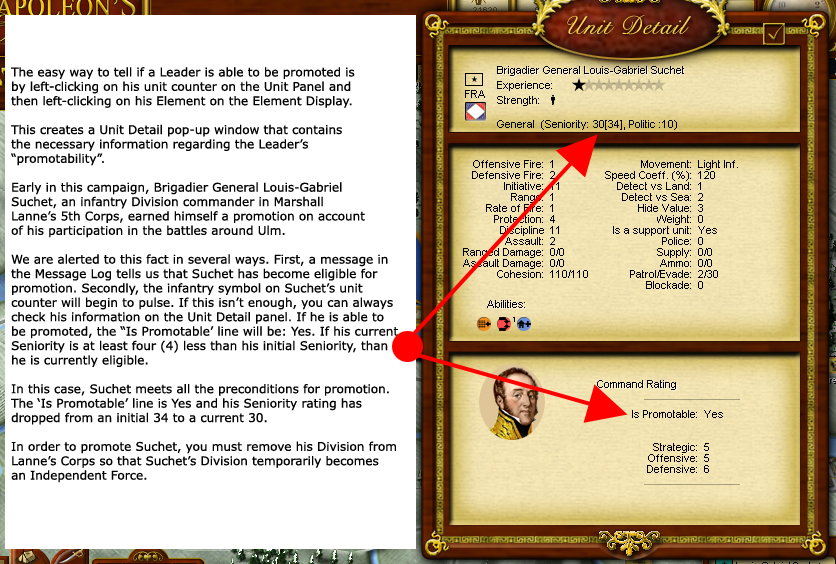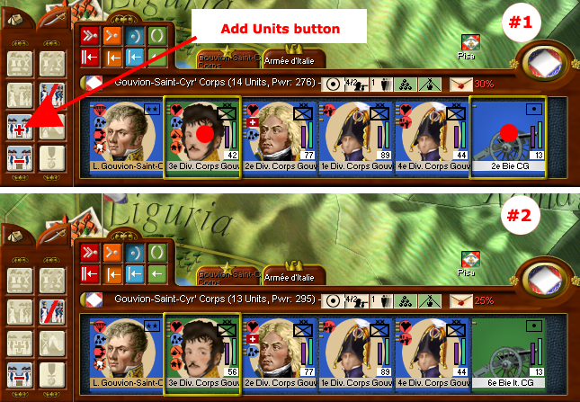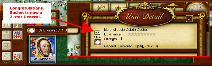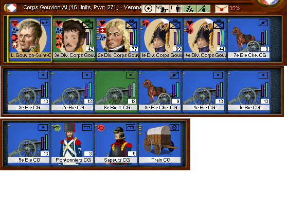 But let's look at a real world example. St Cyr's Corps is attached to Massena's Army of Italy. It consists of 16 units as you see here and is assessed a 35% command penalty (the red 35%) on the Unit Panel ID line.