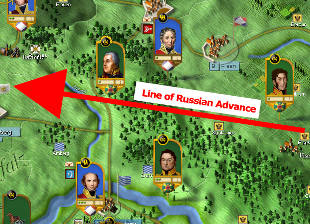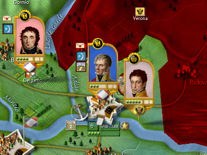 Therefore, St Cyr and his division commanders are limited to twelve CPs. St Cyr, however, is a Gifted Commander. This adds two CPs for a total of 14. (St Cyr is also Quickly Angered. If he was an Army Cdr instead of a mere Corps cdr, the -4 CP penalty would apply.) He gets no bonus from Massena (the Army cdr) because this is the first turn of the scenario. Otherwise Massena would influence the amount of CPs St Cyr generates.