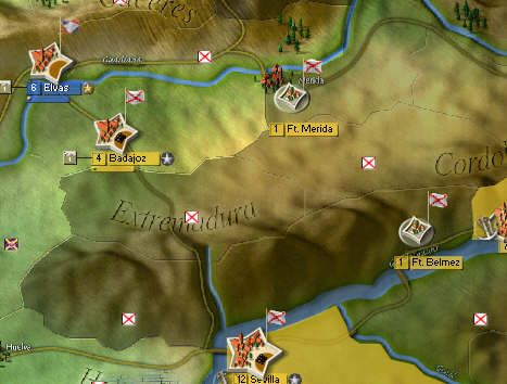 Peninsular war, when you click on "show who is controling strategic towns" button, Badajoz and Elvas are not highlighted, blue nor yellow. In the picture you can see Sevilla and Cordoba highlighted, but not Badajoz and Elvas