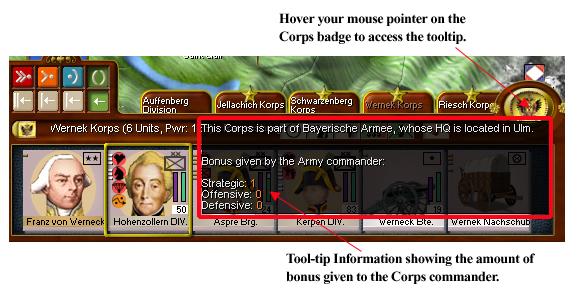 The bonuses that an Army commander gives to his Corps commanders is shown on a tool-tip. Army commander bonuses are never displayed on the first turn of the game or on the turn that a Corps is created or affiliated with an Army HQ. Allow a turn to be resolved before checking for Army bonuses in these cases.