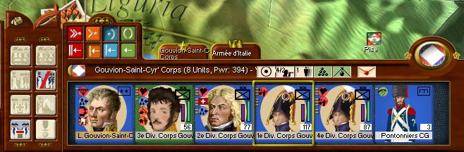 But let's look at a real world example. St Cyr's Corps is attached to Massena's Army of Italy. It consists of 16 units as you see here and is assessed a 35% command penalty (the red 35%) on the Unit Panel ID line.