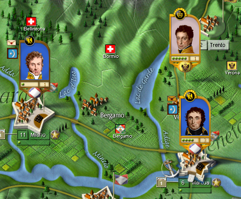 Not much happened this turn other than both sides are repositioning for the upcoming battle along the approaches to Wien. In the south, a detachment of French infantry captured the depot at Trento further isolating Karl’s army in Bergamo.