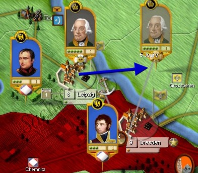 1. Pourquoi mes unités se voient-elles imposer (par le jeu) une trajectoire dans certains cas de franchissement d'une zone d'eaux peu profondes. Dernier exemple en date (voir capture01), je souhaite faire passer l'armée prussienne de Leipziq à Grossberen et le jeu m'impose une trajectoire passant par les ponts de Dresden.