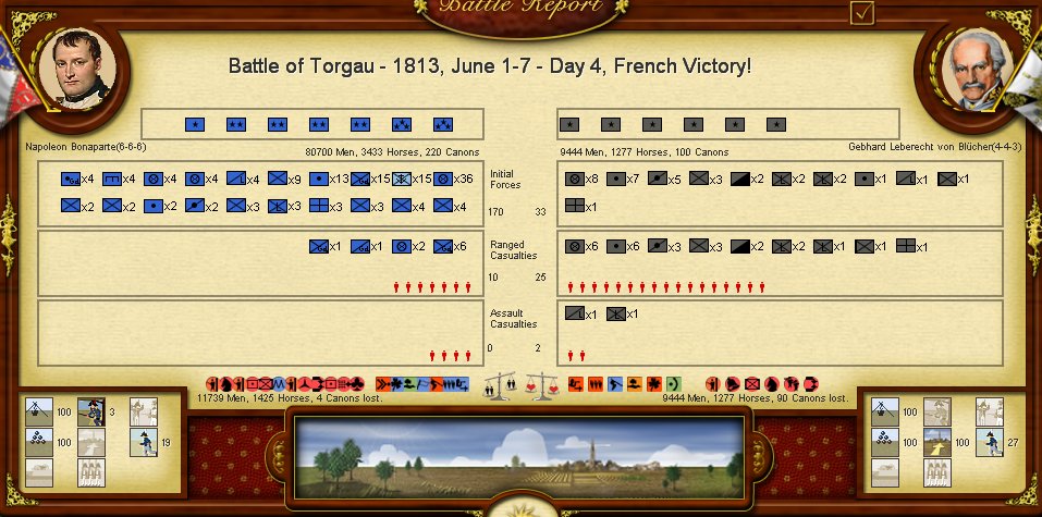 La AI es mucho más pasiva, aunque basicamente mi oponente ha jugado a la defensiva, lo que me permitía tomar rápidamente Hamburgo y avanzar por el norte del Elba hacia Berlín, lo que con el avance de Eugene al sur del Elba se formaba una pinza de efectos devastadores. En este caso mi fallo ha sido no avanzar antes con Eugene tras la falta de resultados en Hamburgo