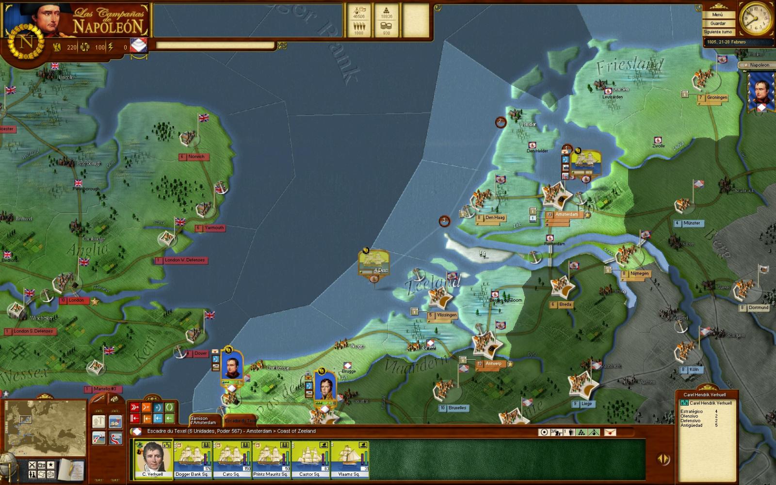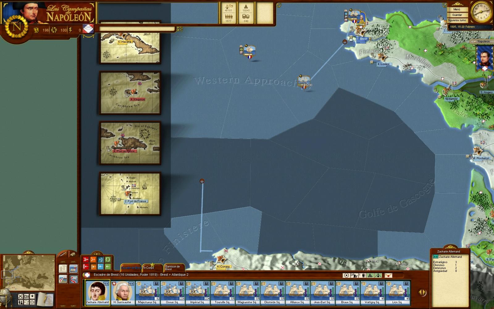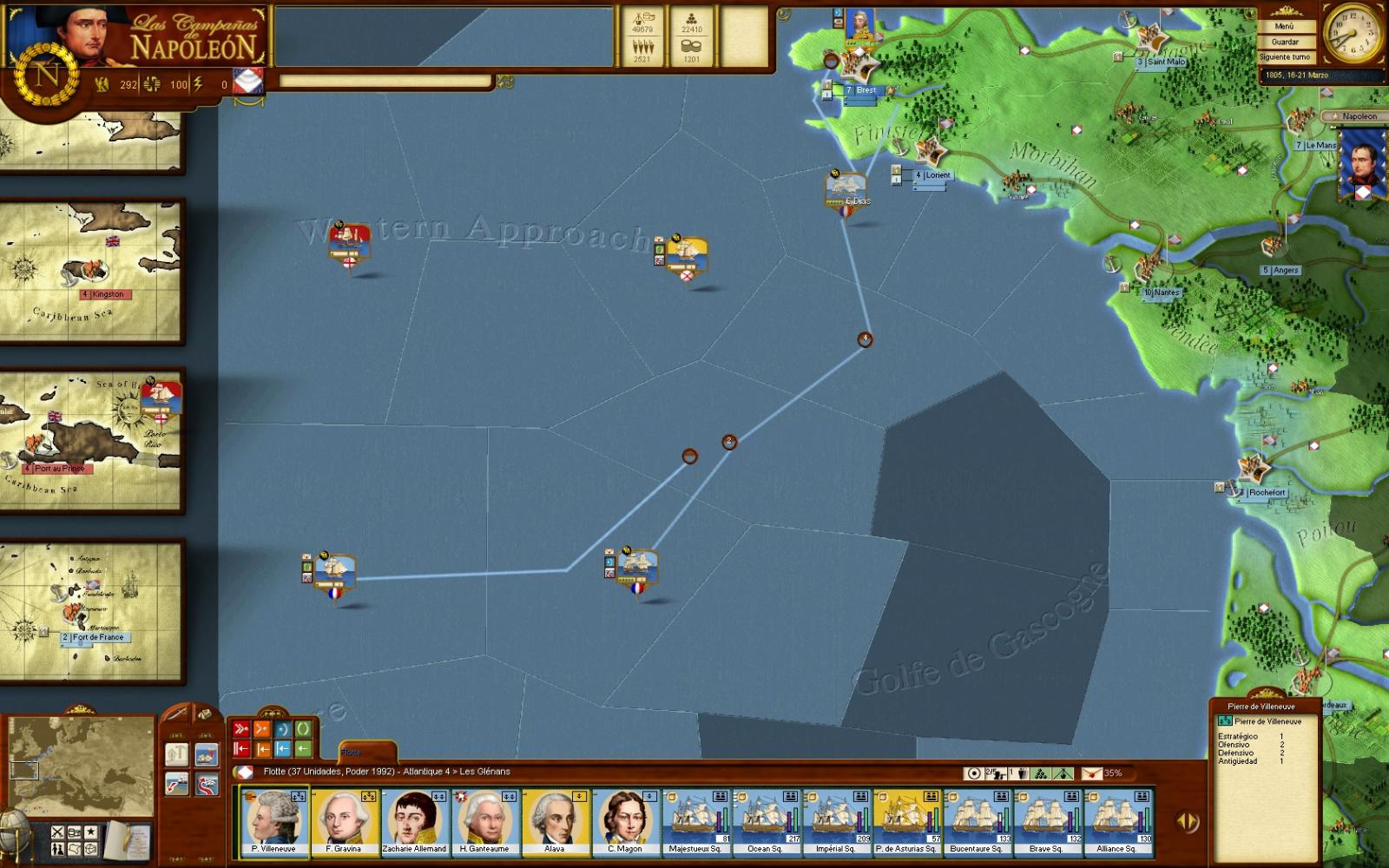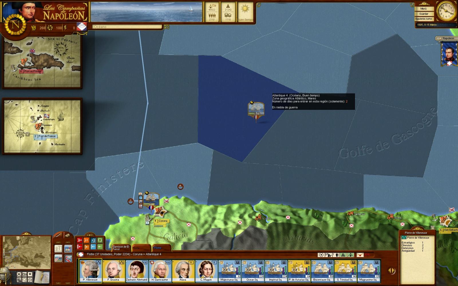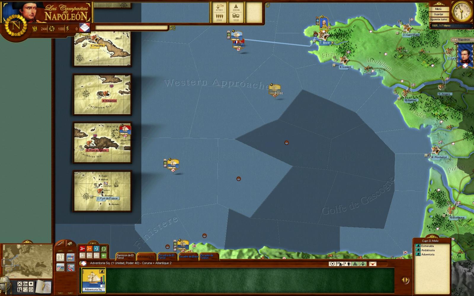 De momento va bien la cosa. Hay que embocar el Canal de la Mancha pronto, aprovechando que el grueso de la flota inglesa paree estar merodeando por el Estrecho. El petit corso está de un impaciente...