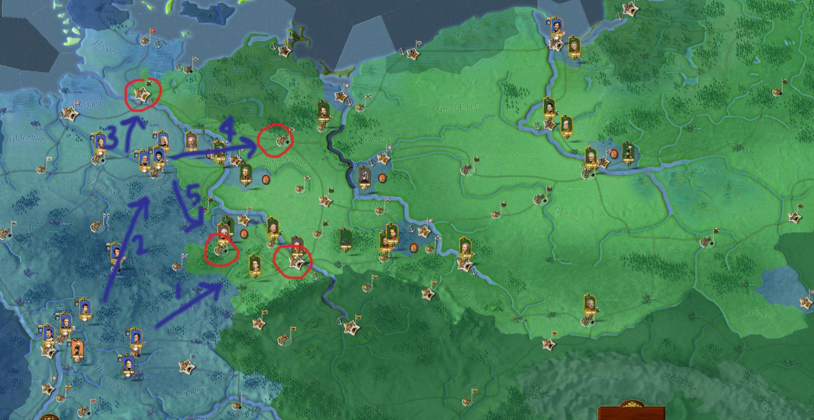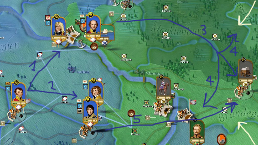 No hay novedades tras la derrota de Hamburgo, las fuerzas son insuficientes para capturar la ciudad a pesar de la artillería del fuerte capturada :( Nuevo cuerpo disponible, mando de Vandamme, las opciones son dirigirlo al norte para apoyar a davout (1), o al este para reforzar el ejército del Elba (2) en su avance sobre Magdeburgo y si es posible Berlín (5)