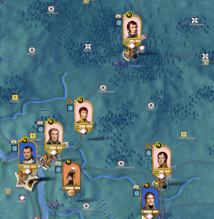 Con círculos azules tenemos las fortalezas bajo control francés, situadas al este del Ejército del Elba (Eugene). Están localizadas a lo largo de los tres ríos del centro de Europa, de este a oeste y de norte a sur: