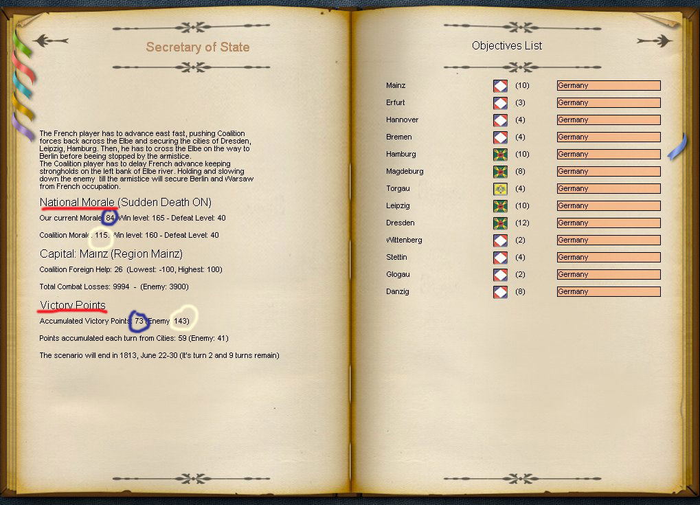 El resultado es este, por primera vez supero en puntos de victoria a la coalición, la victoria de Leipzig compensa la ineficacia en Hamburgo y la rendición de los sajones en Torgau