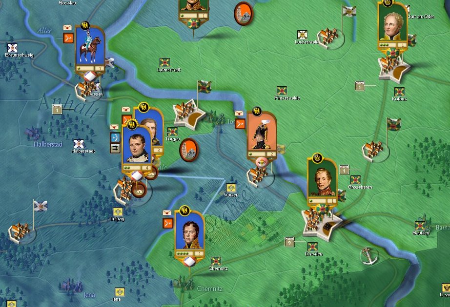 A su vez Napoleon debería tomar primero Torgau para avanzar hacia Dresde, comienzo con aislarlo, capturaré las ciudades adyacentes de Dessau y Wurzer para rodear completamente Torgau antes del asalto
