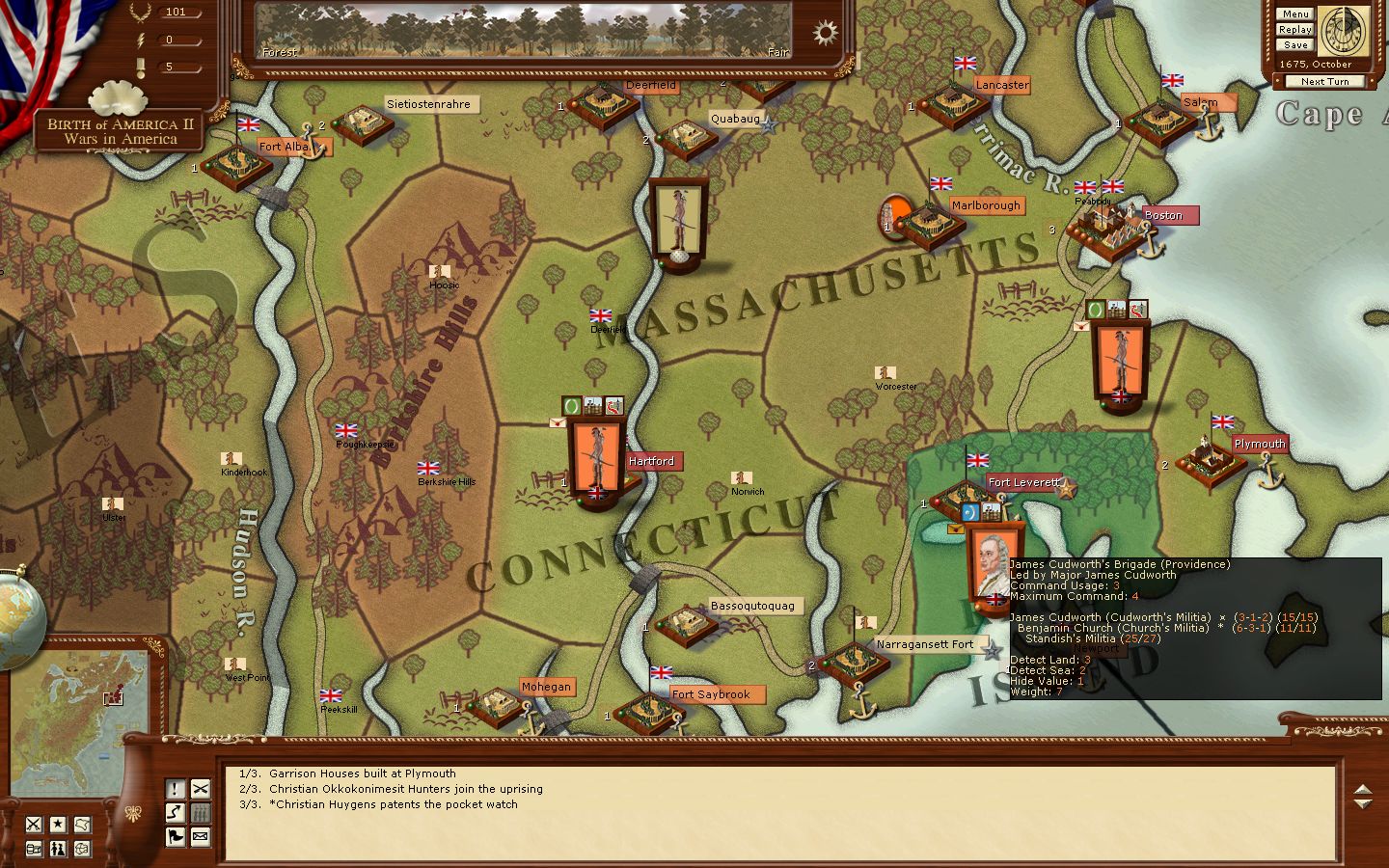 Some very interesting points and ideas! Just before I release King Philip's War I will make some further tests with the Pontiac scenario for the early Indian assaults against Detroit and Pitt and make some small changes if I think they are needed. I have a feeling that you may have got lucky as I have certainly been beaten back at Detroit a few times when attempting an early assault with a large Indian force (the Indians should probably never assault the larger forts for historical reasons but this muted change never made it into the game). But I want to make sure the balance is good and there is some danger that the Indians will suffer fairly heavy casualties sometimes if their assault fails. It hopefully is just down to the roll of the die and not a strategy that will always result in victory. Also was there time to send Dalyell to reinforce Detroit?