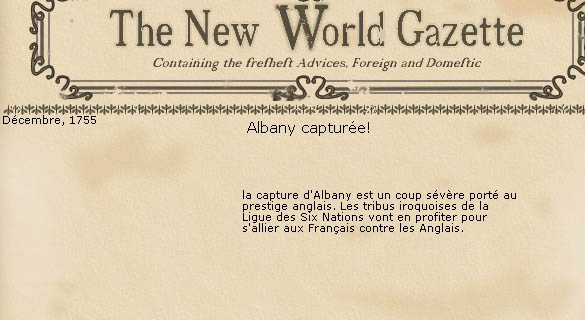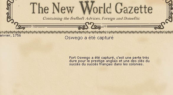 Enfin, la première fois que j'ai pris Oswego (juillet 1755 je crois) j'ai reçu un gain de point de victoire et l'anglais en a perdu. Lorsque j'ai plus tard capturé Albany, l'évènement d'Oswego s'est répété, j'ai eu un message m'avertissant de la prise d'Oswego (mais cette fois avec une coupure de journal alors qu'il n'y en avait pas eu la première fois - sans illustration non plus) et encore un gain de PV pour moi et une autre perte pour l'anglais.