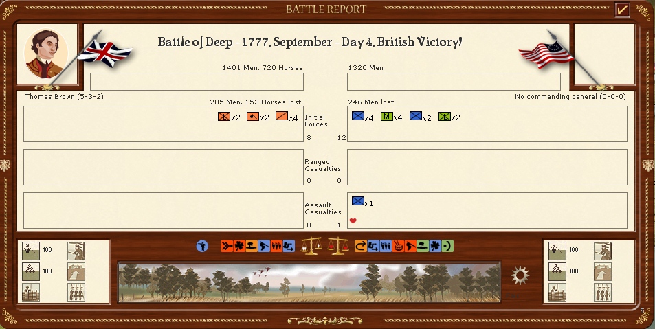 Tarleton has clashed with William Crawfords army near charlotte and comes off worst,However Crawford disapears into the wilderness.