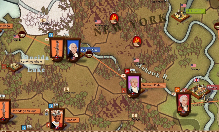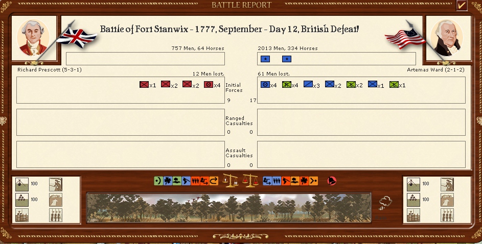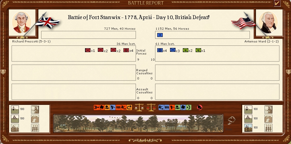Prescotts brigade has marched to attack Ft Stanwix but is repulsed,He will now await the arrival of the German Rall's brigade and attack next turn.