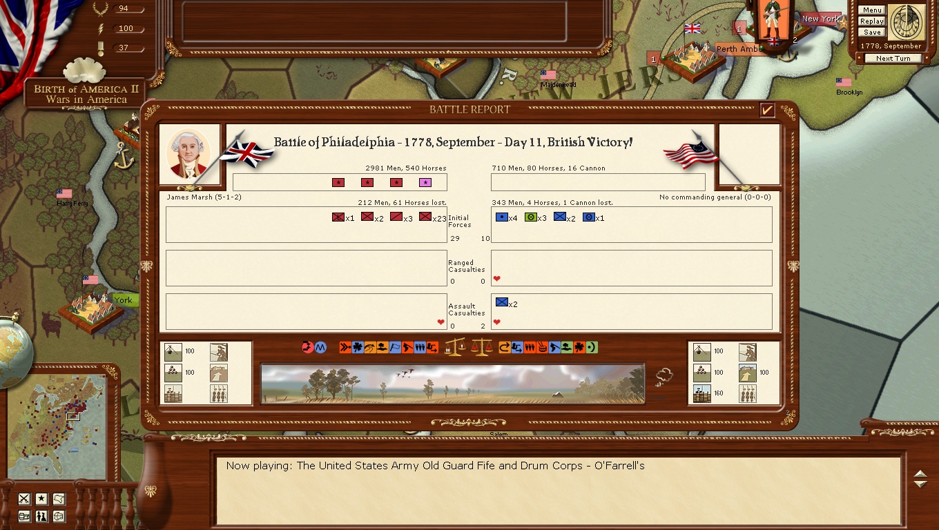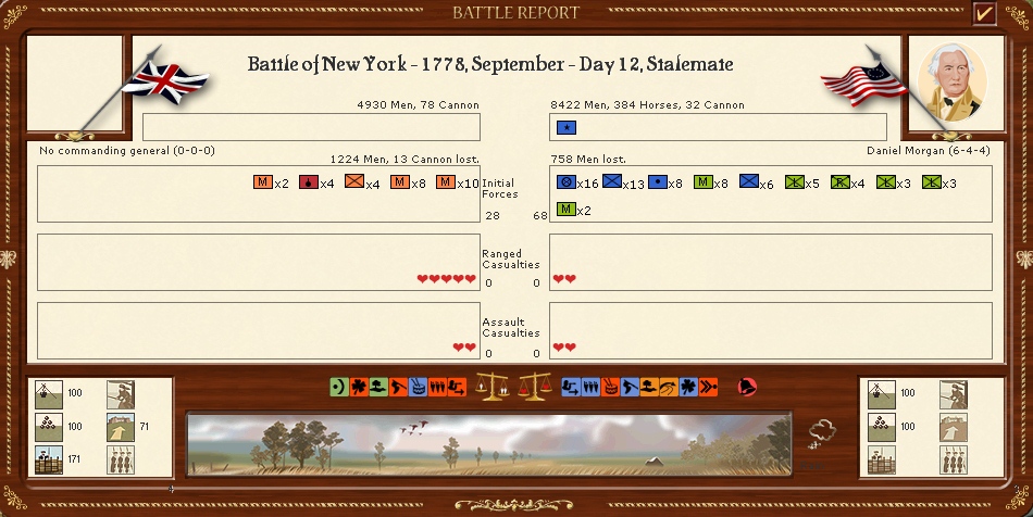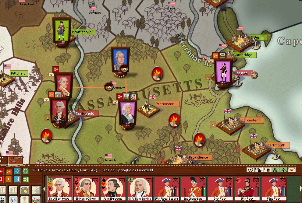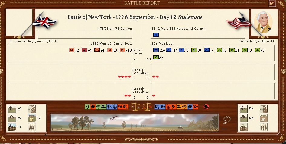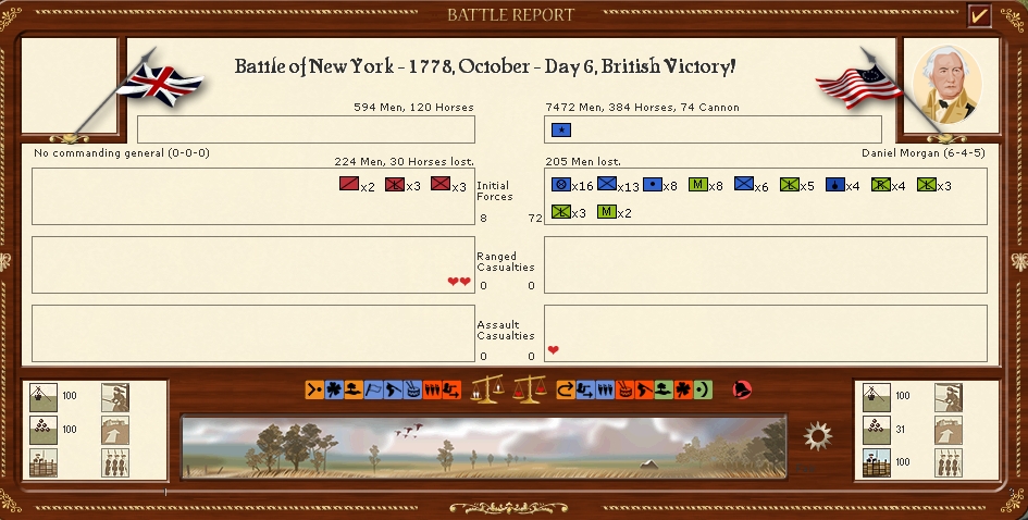 The armies in New England are resting for the moment in the hope that i can resume operations soon however a lot of the battalions are well below strengh.