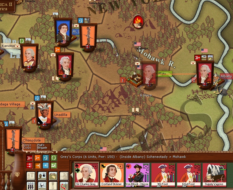 The Mowhawk vally is proving difficult to capture so Sir Charles Grey marches out of Albany with a strong brigade to put an end to the rebelion there and stirs up a hornets nest of rebels and fights four battles and captures Fort Drayton.