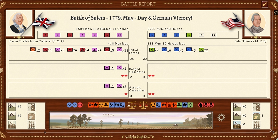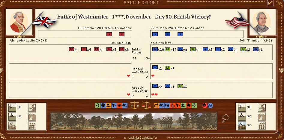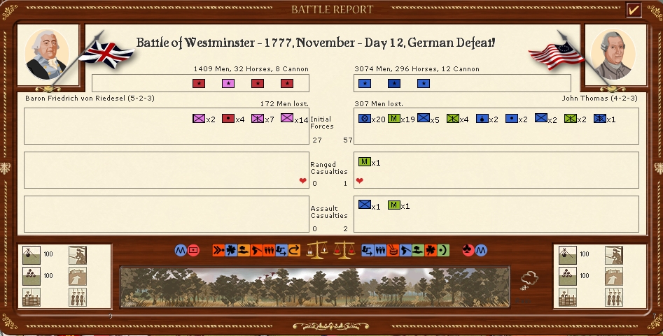 In New England Leslies corps of 6 battalions and Von Riedesels corps of 9 battalions move to engage the American Thomas's army in westminster who is attacked twice.