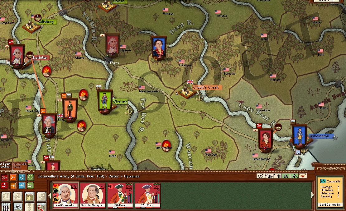 Crawfords rebel brigade attacks and captures Charlotte destroying the militia regiment i had garrisoning the town.Major General Leslie will take control of Von Loss brigagde and march on Charlotte and hope to join force's with Cornwallis to engage the French army at Wilmington