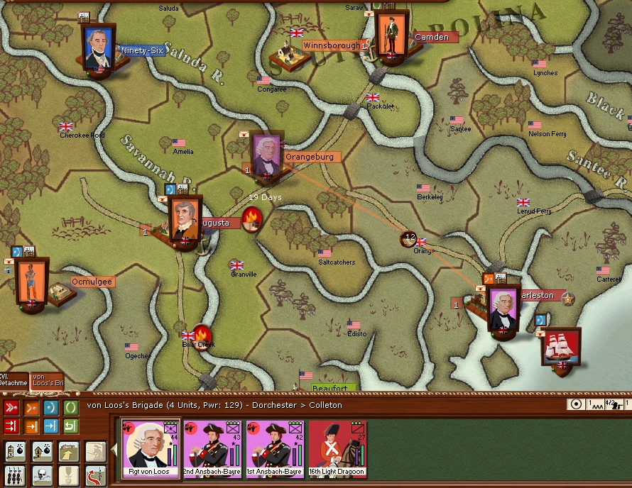 In the deep south General Leslie and his army have landed at Charleston and will march inland and join up with Colonel Von Loos at Camden.