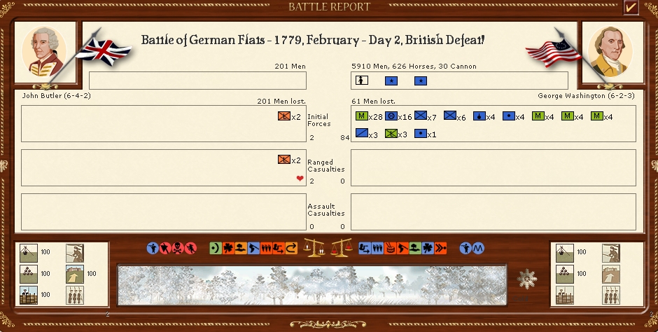 The bad weather is starting to turn to spring now so campaining will begin next turn,General Washington and Greene are spotted in Durham and Derry and will be brought to battle in the comming monthes.