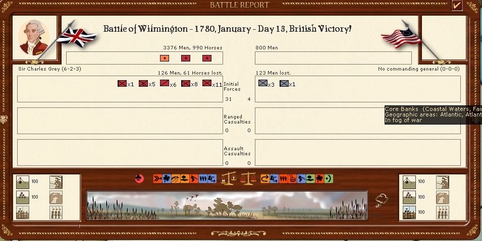 Leslies corps is resting in Salisbury North Carolina before hunting down the French,Sir Charles Grey has marched along the coast to capture the port of Wilmington inflicting serious losses on the rebels before marching victorious into the town.