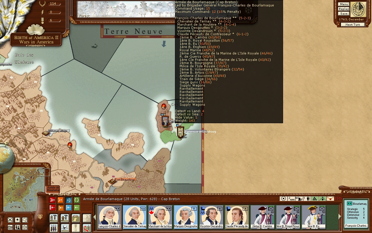 I started my conquest with Forbes I got Quebec in late game and move west to Montreal(he Started 2 star generals ended up with 3 and some experience in defensive rating). But Marques de Montcolm was waiting in montreal. When I was in adjacent region he attacked me and I severely lost the battle. My other army was in albamy. With Washington as a commander of my of the ragional(line infantry) forces and trained many of them but I was not really good at orginizing forces and it was very late for them to join the battle at Montreal.