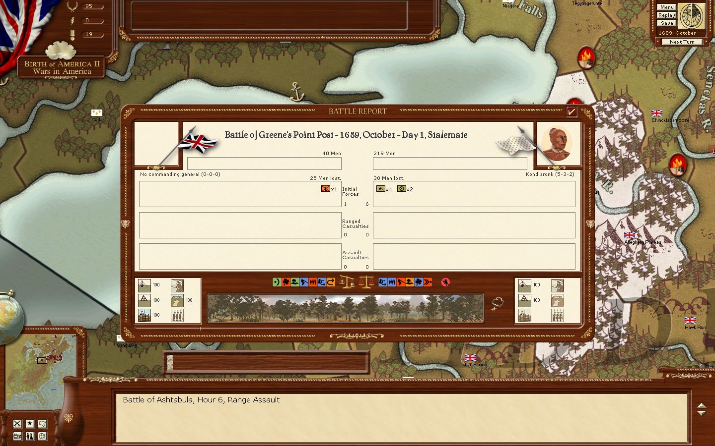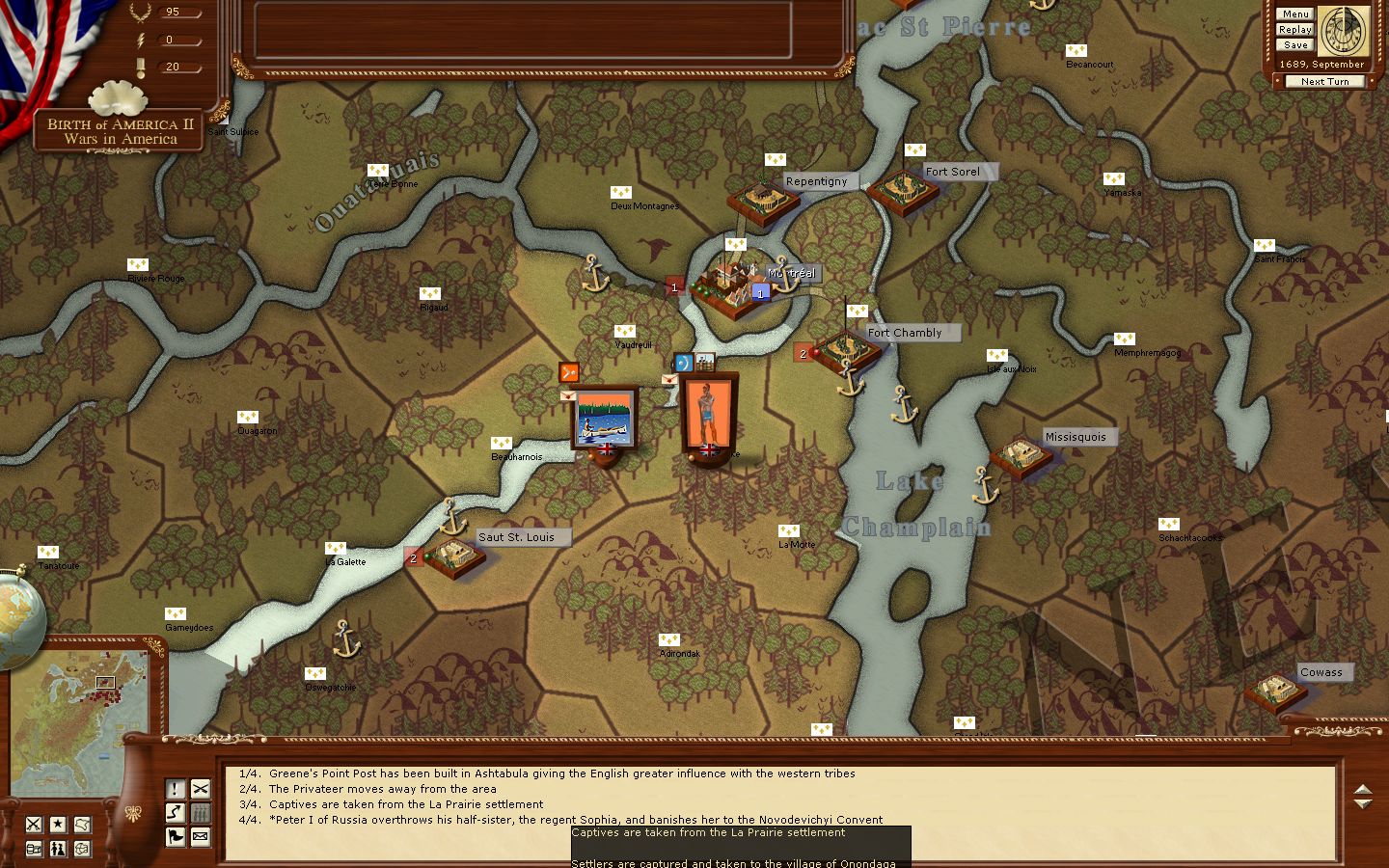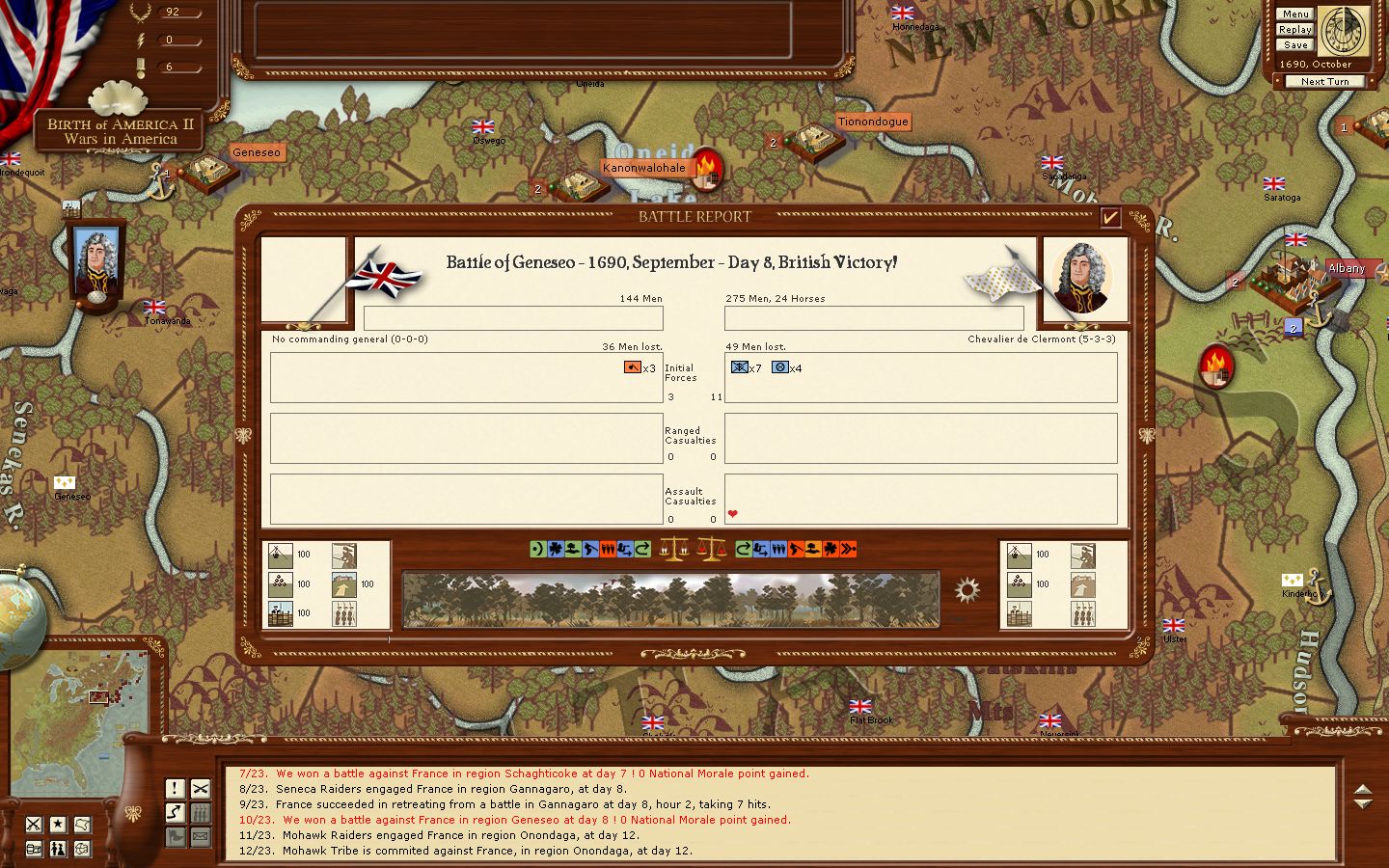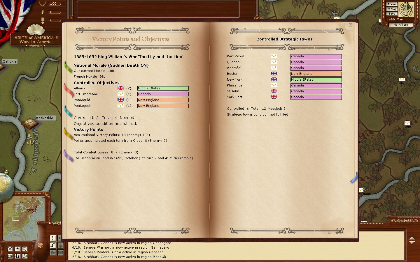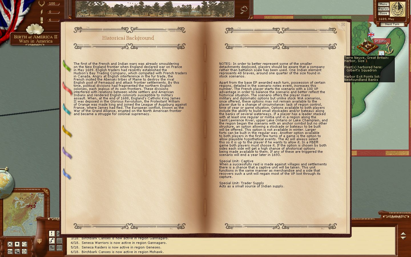 The King William’s War scenario offers the player many military and diplomatic options. As with the Pontiac scenario, but unlike other WiA scenarios, once offered, these options may not remain available to the player due to a change of circumstance; lack of region control, time of year or game situation.
