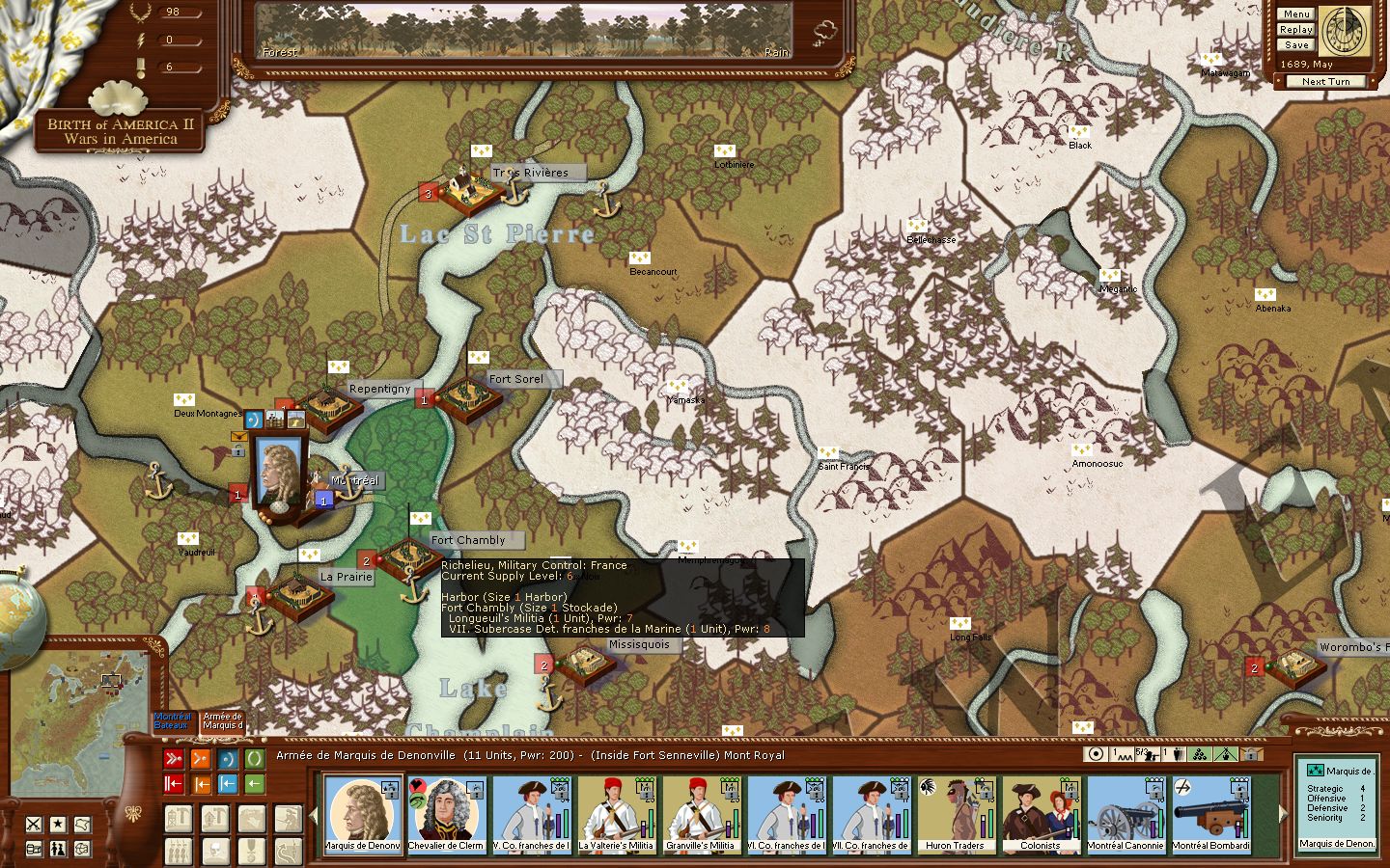 French forces in Montréal at game start. Québec houses a similar garrison. Frontenac is yet to make his return to New France.