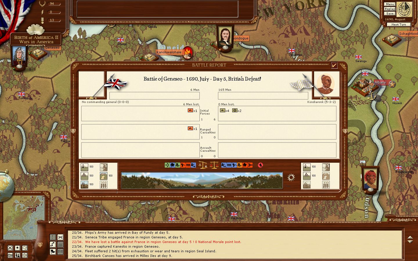 A privateer spots Frontenac making an early return to New France. This should prevent the French from abandoning fort Frontenac due to the difficulty of maintaining such an isolated position. Historically Frontenac tried to stop the abandonment when he arrived but was too late after his return to New France was slowed by storms. I should mention that we have not chosen the ahistorical option for this AAR which can result in fairly major changes - but small differences like this can occur randomly in the scenario to ensure replayability.