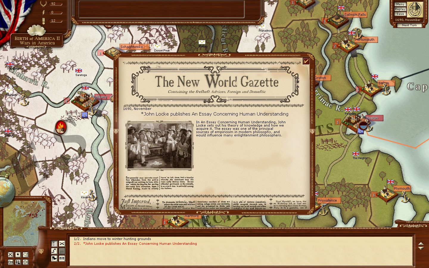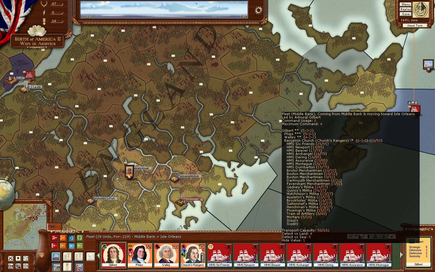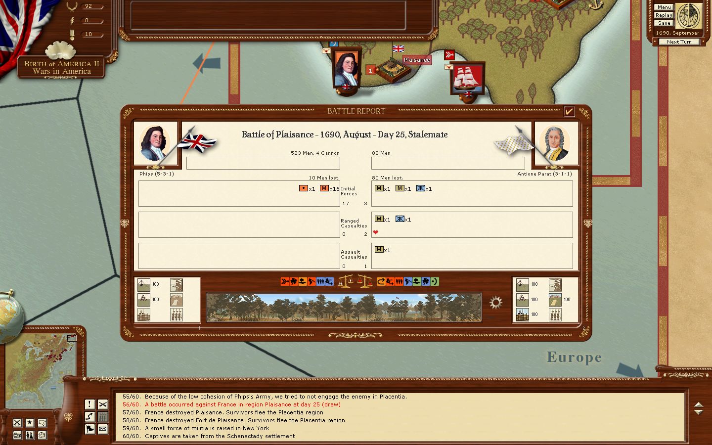 If the option is chosen by both sides each side will get a high chance of ahistorical options being made available to them (but they won't know if this is the case until the options appear). In reality both sides could have fielded stronger armies. Phips proposed another attack against Québec after his abortive 1690 attempt while the French had ideas for an attack against the eastern seaboard. If both sides have chosen to allow hypothetical events it may be that only one side will be given the opportunity. They may also lose the chance depending on game situation. The options will have a cost in both EP and VP so they will not be easy options and are designed to give players a different experience rather than an easier one. Of course being options - the player may choose not to take them when offered. If this option is chosen and is triggered the scenario will end a year later in 1693.